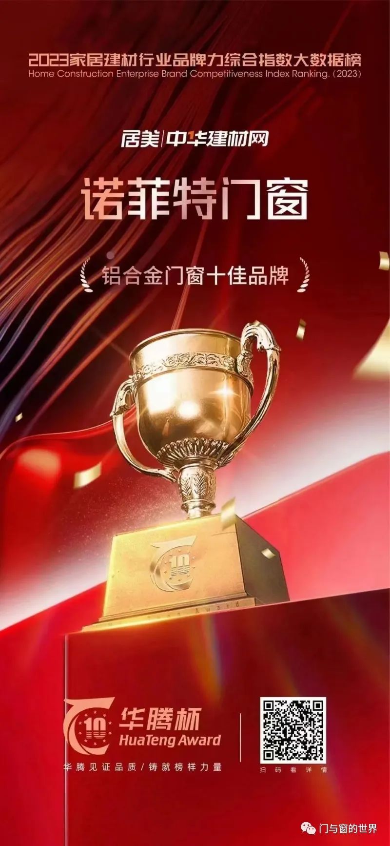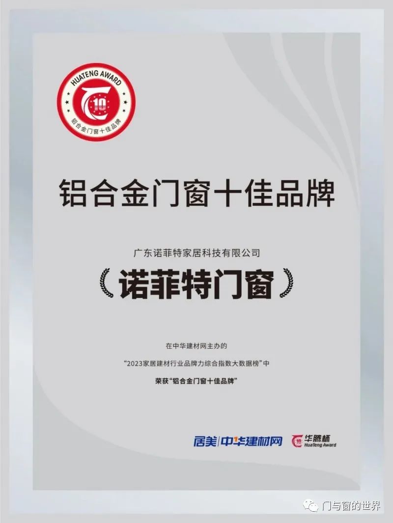 诺菲特门窗凭借雄厚实力和品牌影响力,在众多品牌中脱颖而出,再次登榜“华腾杯”2023铝合金门窗十佳品牌。