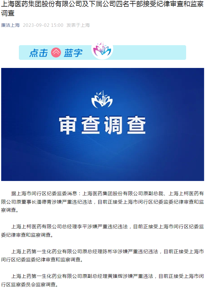 刚刚,“廉洁上海”公众号发布通报称,上海医药集团及下属公司4名领导干部接受上海市闵行区纪委监委审查和调查。