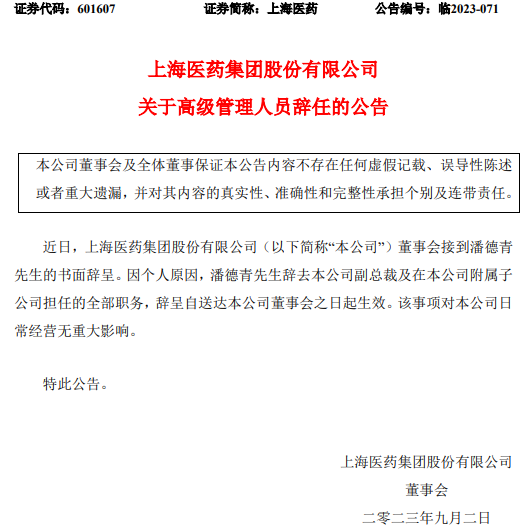 另据上海医药公告,董事会接到潘德青的书面辞呈。因个人原因,潘德青辞去公司副总裁及在公司附属子公司担任的全部职务,辞呈自送达公司董事会之日起生效。