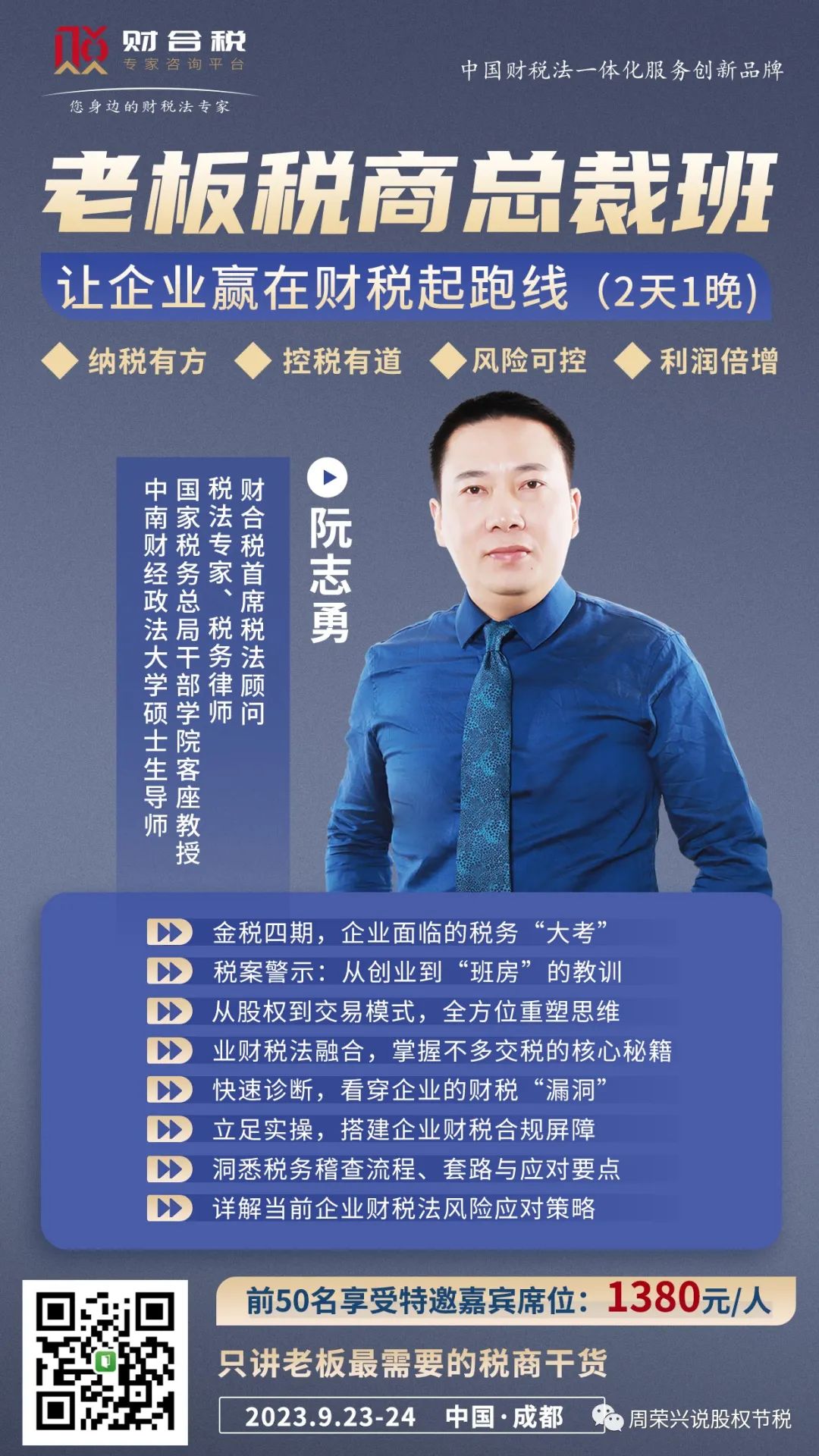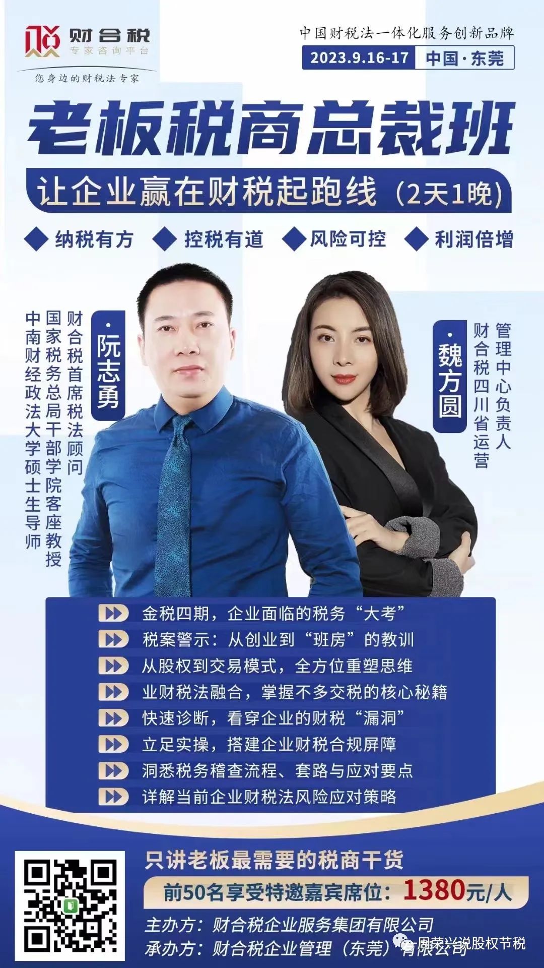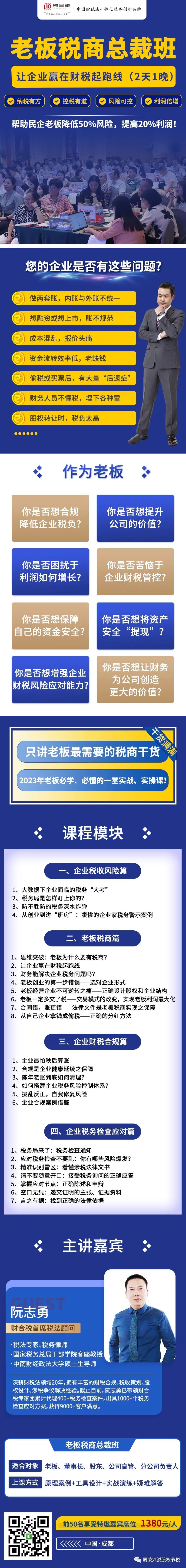 九月份《老板税商总裁班》在东莞(9.16-17)和成都(9.23-24)开课,欢迎报名参加!报名请直接公众号私信!
