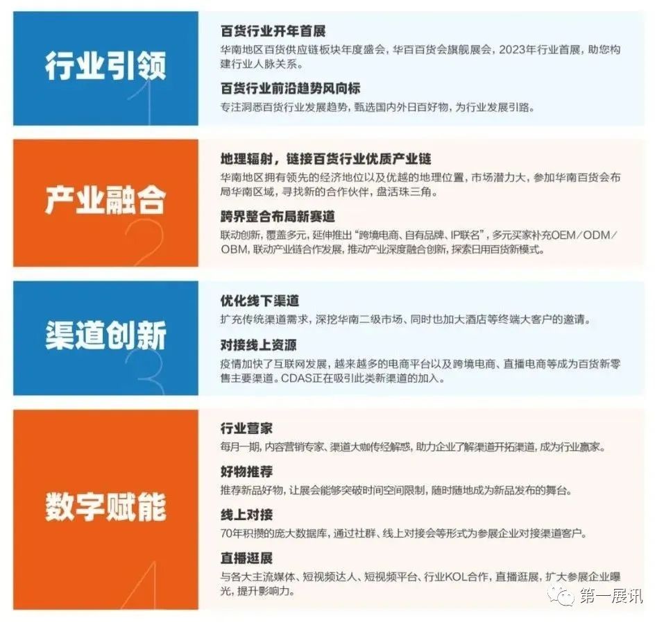 华南日用百货商品交易会(以下简称华南百货展)是励展华百百货会旗下品牌展会,将于2023年9月22-24日首登中国进出口商品交易会(琶洲)会展中心。华南百货展辐射华南及国际市场,为百货行业搭建高品质的全产业链的创新展示平台,也为日新月异的华南百货市场创造更多商机。华百百货会是亚洲范围内历史悠久的家居用品行业旗舰展会, 1953年创建以来一直倍受业界信任,成为家庭用品行业专业交易和合作交流平台。每年7月底在上海举办。来自国内外数千家知名品牌竞相参与,提供行业新品以及具有市场竞争力的价格,吸引大量的KA连锁、BC类商超、电商以及品牌商和终端买家过来对接,产品涵盖塑料制品、玻璃制品、不锈钢制品、竹木制品、厨房用品、清洁用品等数十个类别的家庭用品。是不可错过供需对接和采购平台。首次展出将有50000+平米,600+知名参展商同台竞技,带来八大主题品类展区,扩充全新渠道资源,通过同期峰会论坛深度解读日用百货行业趋势。