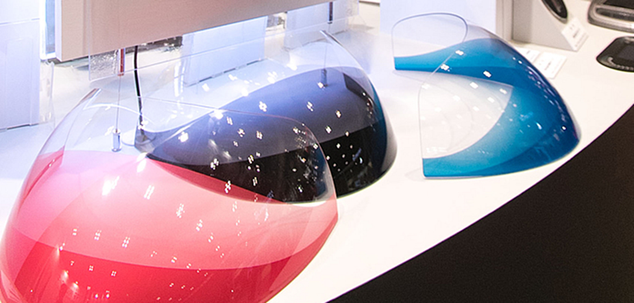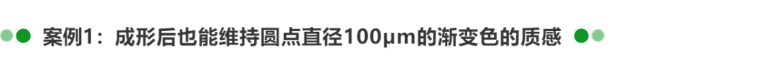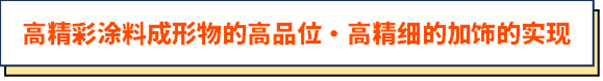 利用FIM/IMD等印刷成形的加饰方法,可以期待从非常高的设计自由度实现想要设计的高精度。对于这种高精度化的要求,成形用高精彩涂料满足了高品位•高精细印刷和良好的成形功能的两立性。基于这两点功能的两立,100µm水平的点状印刷在成形品上可以实现渐变色、线宽100µm水平的细线、 无色斑的美丽的满版等高精度加饰。