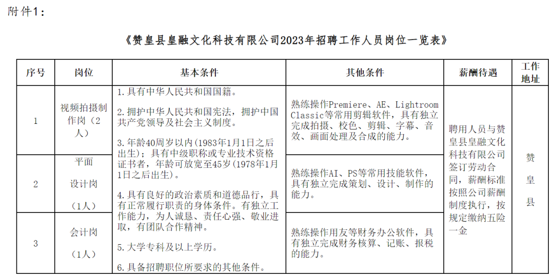 附件1:《赞皇县皇融文化科技有限公司2023年招聘工作人员岗位一览表》