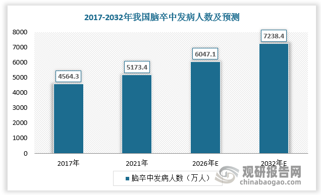 神经介入又称脑血管介入,是利用微创医疗器械和技术治疗中枢神经系统血管疾病。脑卒中具有高发病率、高致残率、高死亡率的特点,已成为危害我国中老年人身体健康和生命的主要疾病。从2017年到2021年,我国脑卒中发病人数从456.根据观研报告网发布的《》显示,4万人增长到517.3万人,复合年增长率为3.2%。预计到2026年和2032年,我国脑卒中发病人数将增长到约604.7万人和723.8万人。