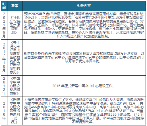 政策方面,国家积极推动高端器械国产化,鼓励医院采购国产产品。在“十四五”规划指导下,国产器械创新审批上市加速,同时国产神经介入医疗器械随着疗法成熟逐步获批上市。