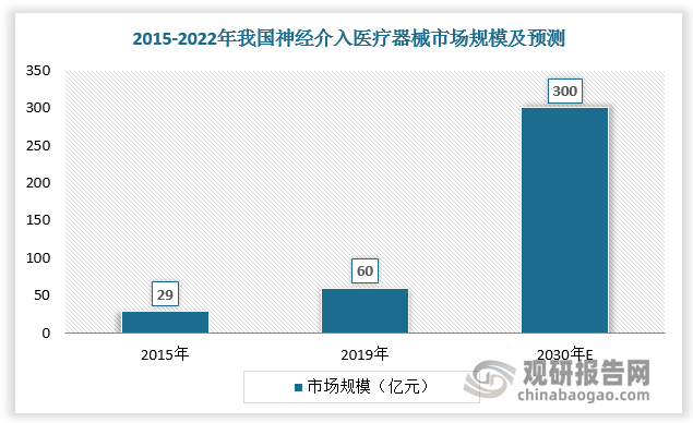 神经介入对于技术以及医护人员的专业度要求都很高,它需要高度专业的神经学家来执行使用当前传统设备的程序,需要推进技术和设备以最大程度地减少介入手术中的失败,因此近年来我国神经介入医疗器械市场需求进入高速增长阶段,市场规模正在逐渐扩大。2015-2019年我国神经介入医疗器械市场规模从29亿元增至60亿元,年复合增长率为20%。预计2030年我国神经介入医疗器械市场规模将达300亿元,2020-2030CAGR为23.2%