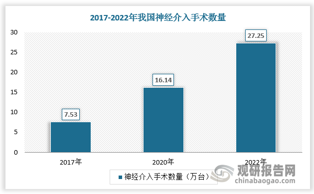 随着国内脑卒中患者数量增多,国家药监局等10部门决定实施加强脑卒中防治工作减少百万新发残疾工程,并联合制定了《加强脑卒中防治工作减少百万新发残疾工程综合方案》,在工作目标中,提出了进一步提升脑卒中防治效果,有效降低发病率及致残率的总体目标,并明确了到2022年、2025年、2030年要达到阶段性目标,包括居民高血压知晓率、静脉溶栓和取栓技术开展情况等。脑卒中防治的推广提高神经介入手术渗透率,2017-2020年我国神经介入手术数量由7.53万台增加至16.14万台,复合年增长率为28.93%,2022年我国神经介入手术数量达约27.25万台。