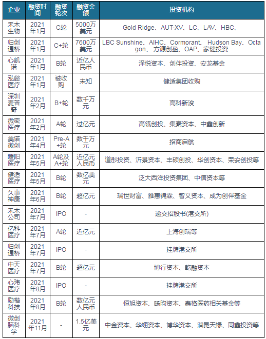 资本方面,现阶段的神经介入领域创新企业资金充足,备受投资机构看好。截至2021年上半年,国内神经介入领域已有至少24家创新企业、60家投资机构押注神经介入领域。