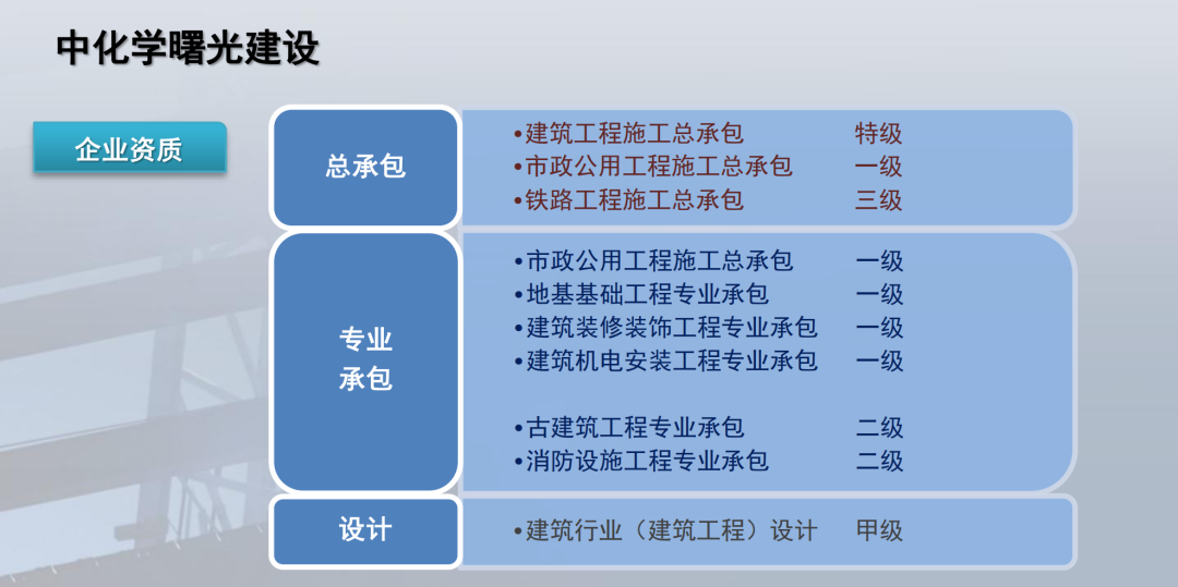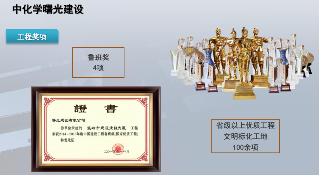 曙光控股集团有限公司是一家综合性的民营企业集团,公司拥有建设、酒店、地产、投资四大产业板块,70余家生产经营单位,经营范围涉及建筑业、房地产业、酒店服务业、商品混凝土、节能建材、太阳能、医药化工、金融、环保、公共事业、生态农业等领域,是温岭市政府质量奖企业、浙商全国500强、浙江省民营企业百强,连续14年上榜“中国民营企业500强”。集团旗下的中化学曙光建设有限公司为集团与中化学土木工程有限公司混改合作的建筑工程公司,系央企中国化学旗下子公司。公司具备建筑工程施工总承包特级,建筑行业(建筑工程)设计甲级,市政公用工程施工总承包一级,地基基础、建筑装修装饰、建筑机电安装专业承包一级及古建筑、消防设施专业承包二级等资质。公司年施工产值超60亿元,是温岭市建筑业龙头企业、台州市建筑业十强施工企业、浙江省先进建筑业企业、全国建筑业 AAA 级信用企业和全国优秀施工企业。