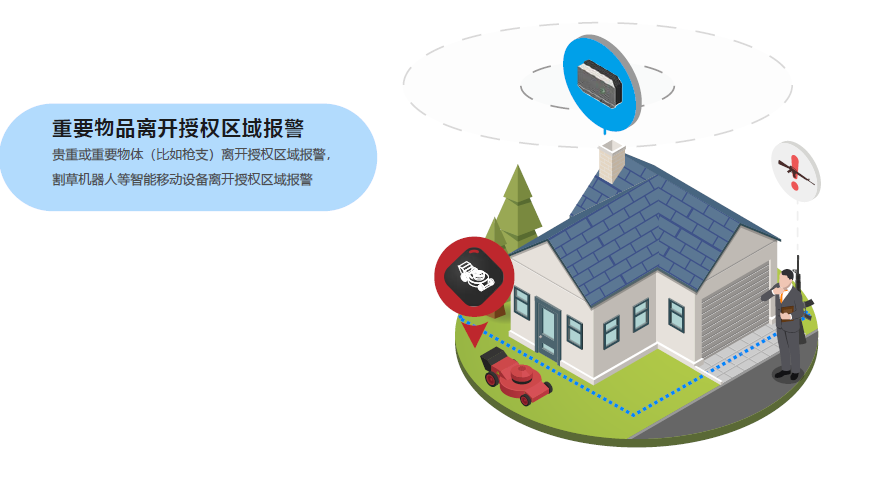 贵重或重要物品(比如枪支)离开区域报警;割草机器人等智能移动设备离开授权区域报警;