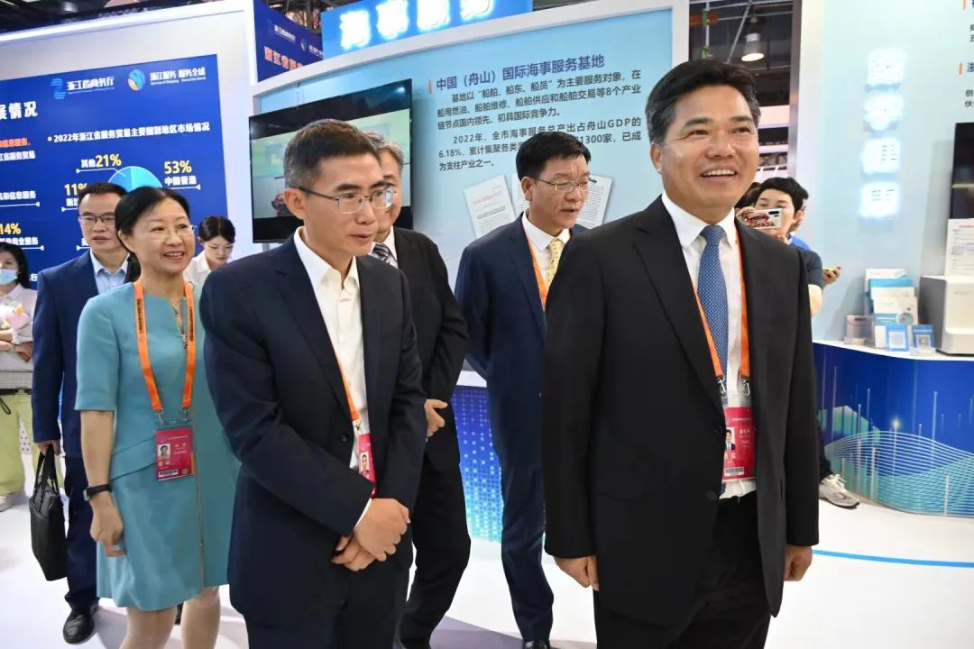 商务部副部长盛秋平、部长助理陈春江、浙江省人民政府副省长卢山参观了服贸会浙江展区,了解展区相关企业的创新亮点。浙江省商务厅厅长韩杰、副厅长胡真舫陪同。