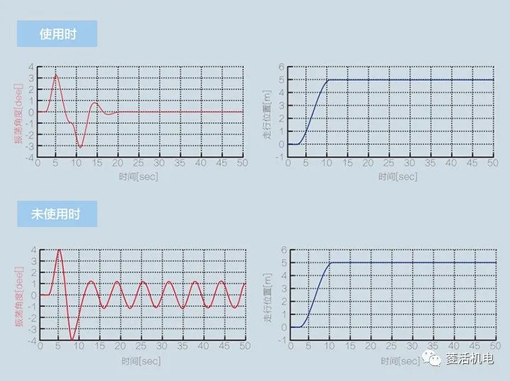 • 根据钢缆长度,货物重量及速度变化率通过变频器内部演算,自动演算出最佳的加减速轨迹,实现抑制晃动。