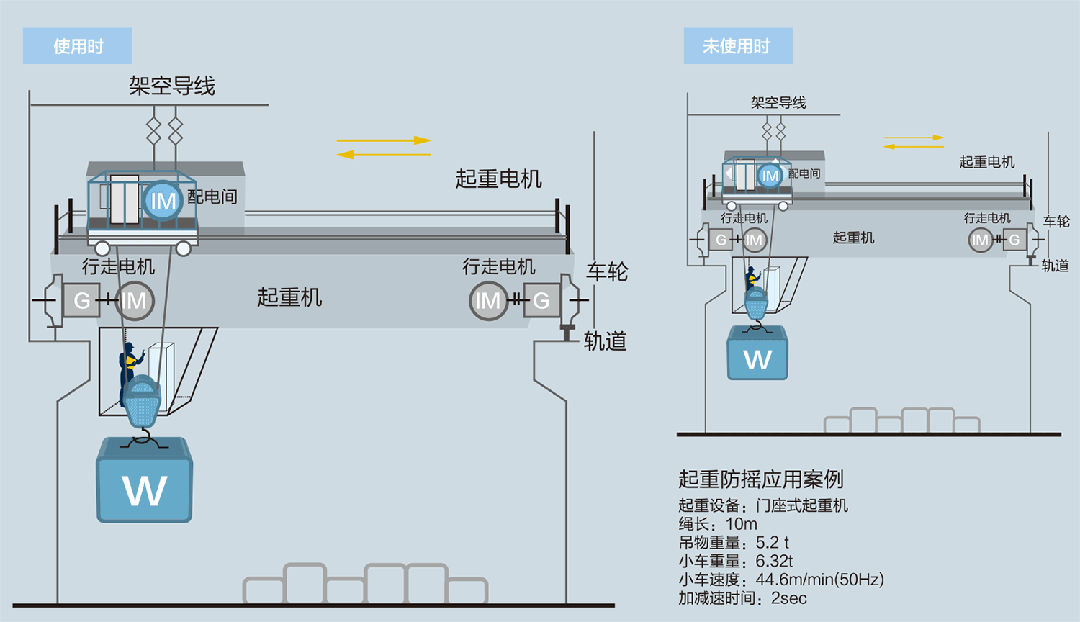 • 在港口,料场,塔机,造船等起重设备的应用中,大车和小车运行停止时,产生的摇晃会影响起重机工作效率及生产安全性,通过变频器内置的防摇功能,在不增加周边成本情况下,使负载的摇动最小化,并提高起重机工作效率。