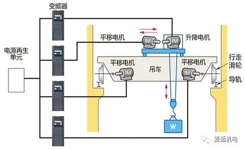 工业行车是应用最普及,使用范围最广的起重设备,一般由升降机构、平移机构(大车、小车)组成。为实现设备网络化,在变频器与PLC之间选择现场总线链接。