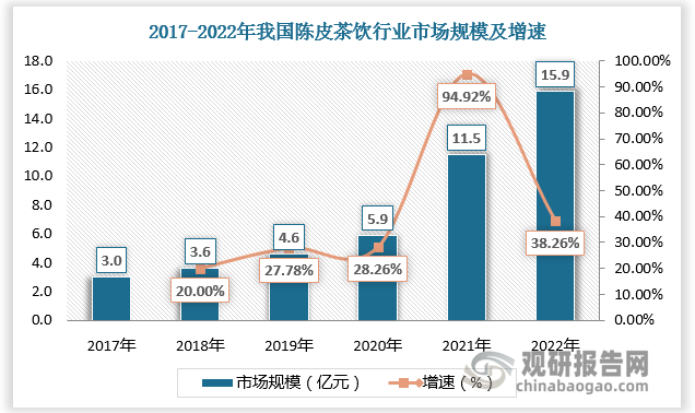 陈皮茶饮产业链下游为销售市场。陈皮茶饮有着悠久的历史和文化传承。它被视为一种传统的中华饮品,深受中国传统文化的影响。因此,陈皮茶饮也具有一定的文化魅力,吸引了一部分追求传统文化的消费者。近年来,随着大众口味的多样化,陈皮茶饮逐渐进入大众的视野,市场规模持续扩大。根据数据,2017-2021年我国陈皮茶饮市场规模由3亿元增长至15.9亿元。