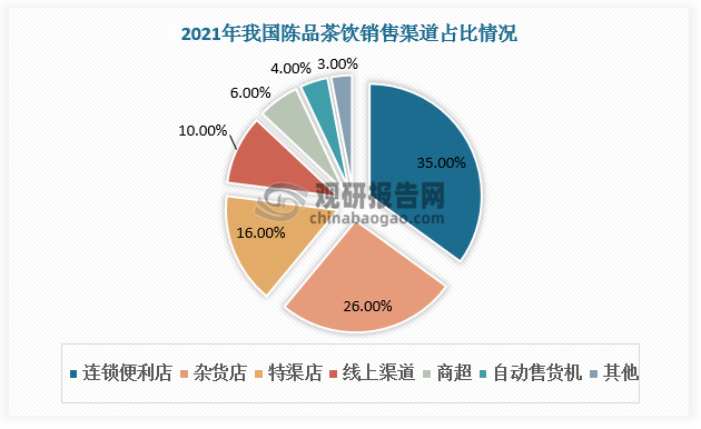 从销售渠道看,我国陈皮茶饮销售渠道包括连锁便利店、自动售货机、商超、线上渠道、特渠店、杂货店等。目前连锁便利店、杂货店、特渠店为我国陈皮茶饮三大销售渠道,分别占比35%、26%、16%。