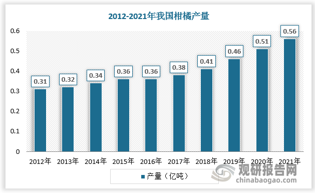 陈皮茶饮是指以陈皮为主要原料制作的茶饮品类。陈皮,也称为陈皮橙或晒普橘,是指晒制过后的普通橘子皮。我国柑橘产量丰富,为陈皮晒制提供坚实基础。根据数据,2012-2021年我国柑橘产量由0.31亿吨增长至0.56亿吨。