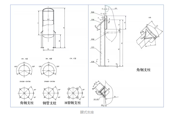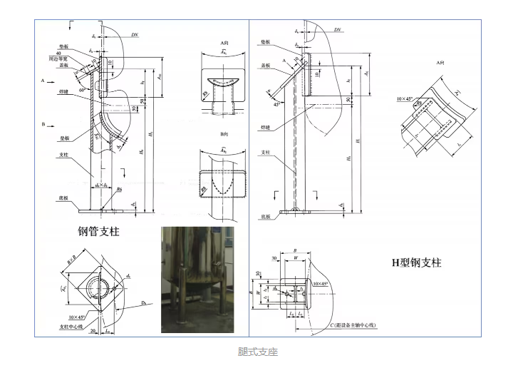 腿式支座分角钢支柱型、钢管支柱型、H岗支柱型,上述三种类型又有是否加装垫板之分故而一共有6种类型。