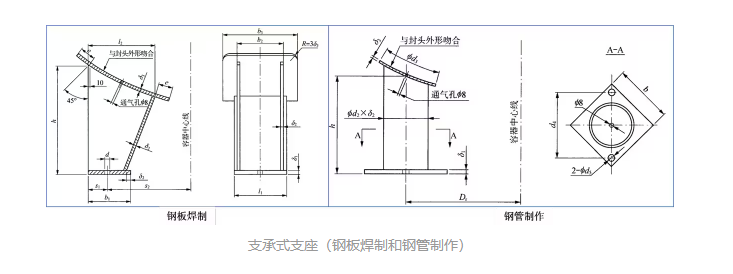 支承式支座是指在容器底部或容器下部外壁焊有数根立柱或数块支承板的支承结构。立柱由圆管或型钢与底板焊成,支承板由两块筋板和底板焊成。在支座与筒体连接处一般都焊有垫板,以减小筒体的局部应力。底板上有螺栓孔,可用螺栓固定于地基之上。在设备周围一般均匀分布三个支承式支座。
