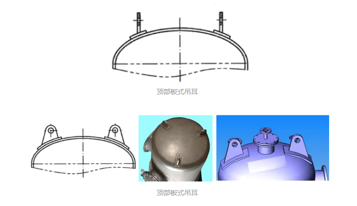 吊耳指焊接在设备上用于固定提升设备所用吊绳、吊钩等的元件。化工设备上常见的吊耳主要有5种,分别为顶部板式吊耳、卧式设备板式吊耳、侧壁板式吊耳、轴式吊耳和尾部吊耳。