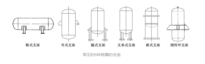 化工设备的常见支座主要有6种,分别是鞍式支座、腿式支座、耳式支座、支承式支座、裙式支座和刚性环式支座。