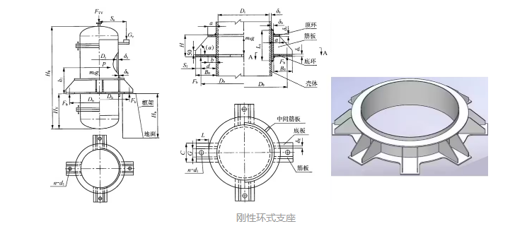 刚性环支座由顶环、底环、底板和筋板组成的结构。刚性环支座在必要时可设置垫板。