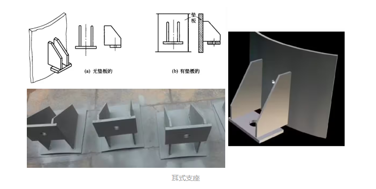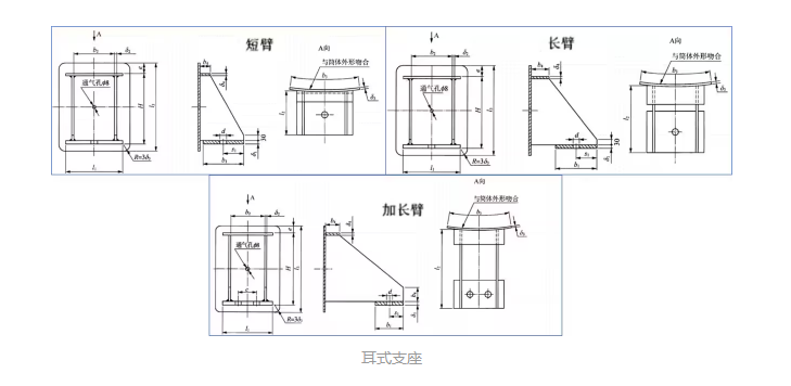 耳式支座也被称为悬挂式支座。耳式支座分为短臂型、长臂型和加长臂型三类类,每类又有带垫板和不带垫板两种。长臂型和加长臂型耳式支座有较大的安装尺寸,当容器外面包有保温层,或者将容器直接放置在楼板上时,宜选用长臂型和加长臂型。