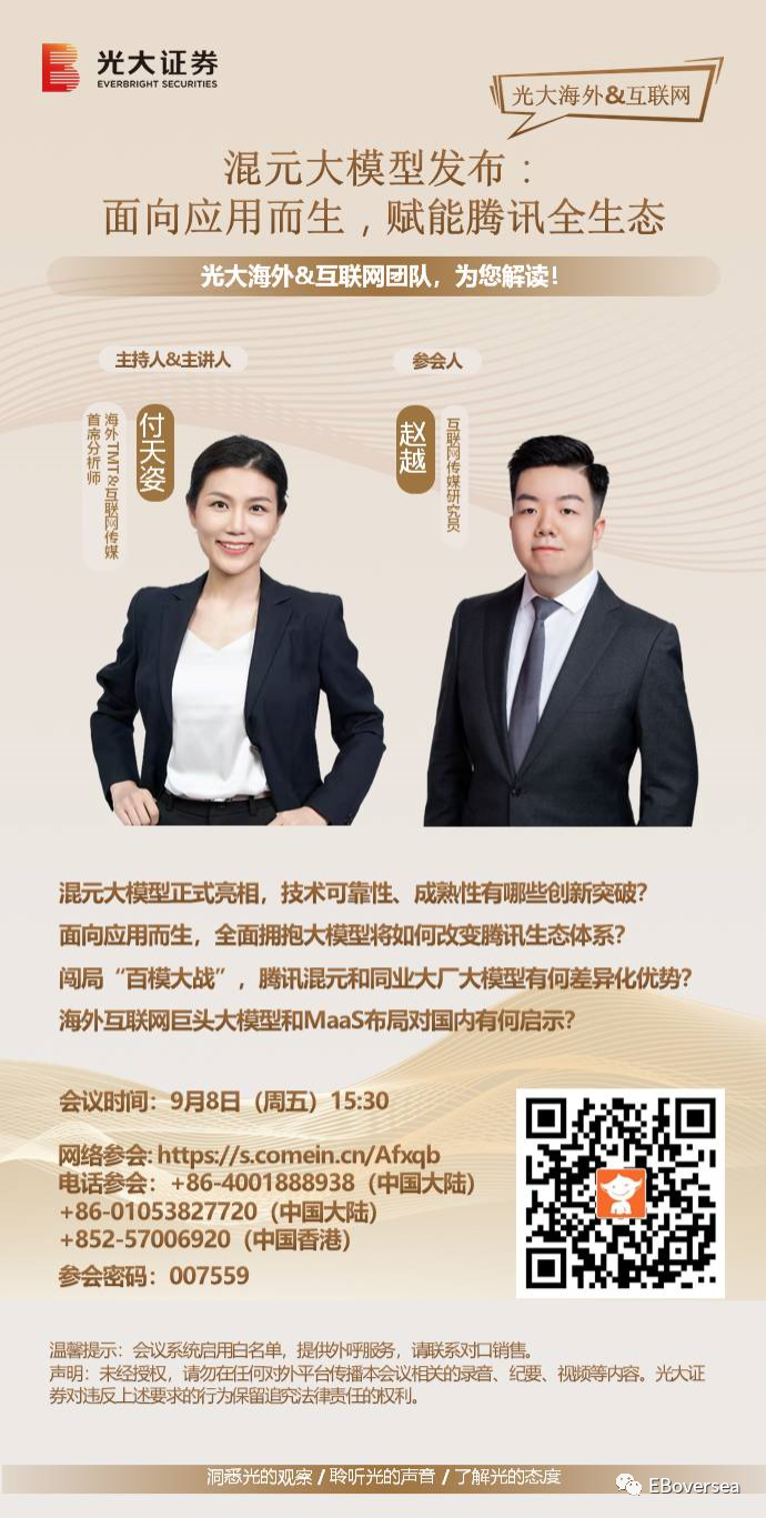 事件:9月7日,2023年腾讯全球数字生态大会召开,腾讯全链路自研通用大语言模型“混元”重磅发布。混元大模型参数规模超千亿,预训练语料超2万亿tokens,