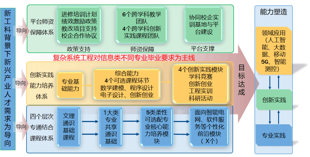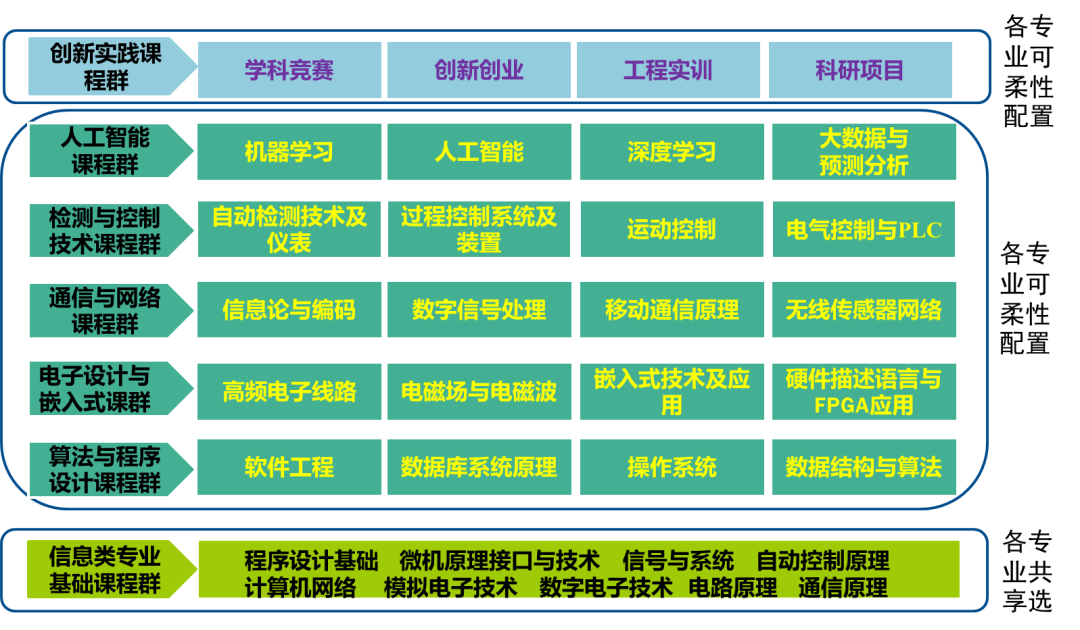(1)结合新工科人才培养目标及新兴产业人才需求,挖掘信息学科内涵和特征,充分梳理各专业对学生能力培养的要求,整合能力需求相近专业,优化专业结构。
