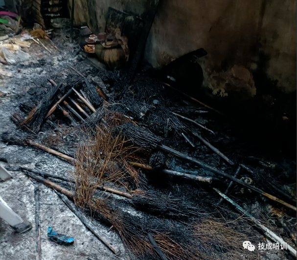 你们看,楼梯都烧融化了,可见火有多猛。所有家庭,人离开要把电器插头拔。
