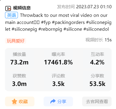嘀嗒狗观察到,博主@loulaslittlenursery_shop于7月23日在TikTok上发布视频获得7320万播放,300万的点赞量,评论数3.5k,分享数达到5.3万,曝光率达到17461.8%。