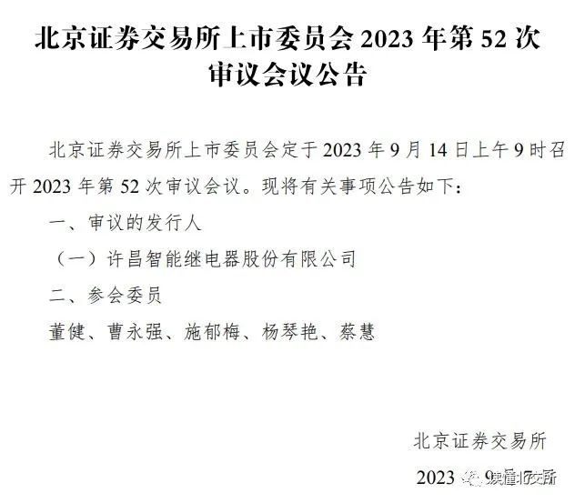 北京证券交易所上市委员会定于2023年9月14日上午9时召开2023年第52次审议会议。现将有关事项公告如下: