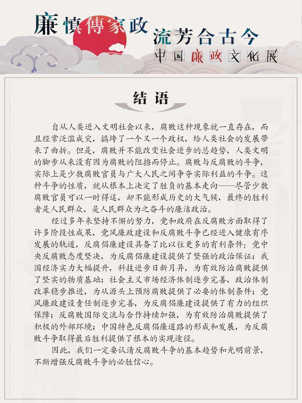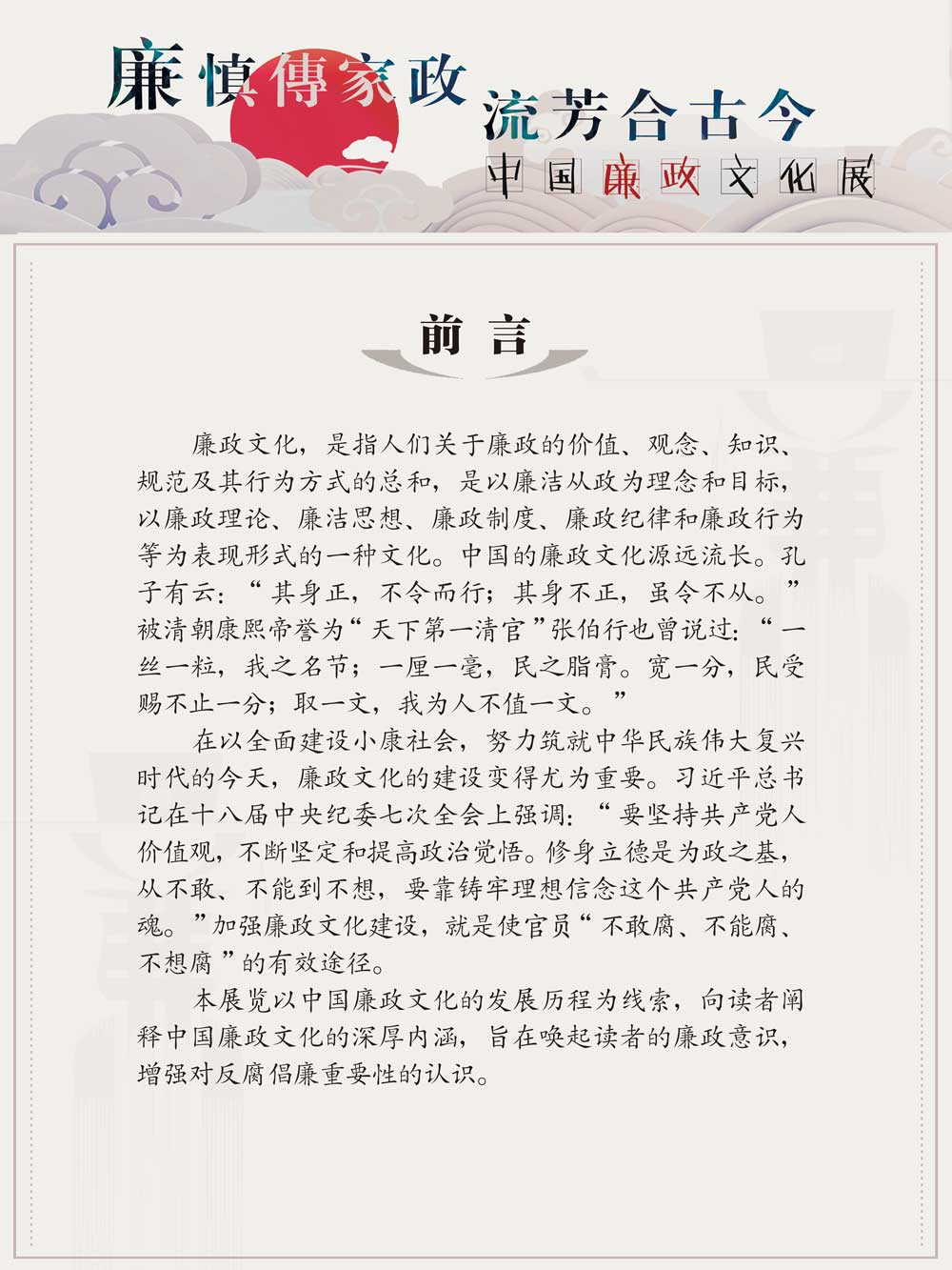 本展览以中国廉政文化的发展历程为线索,向观众阐释中国廉政文化的深厚内涵,旨在唤起观众的廉政意识,增强对反腐倡廉重要性的认识。