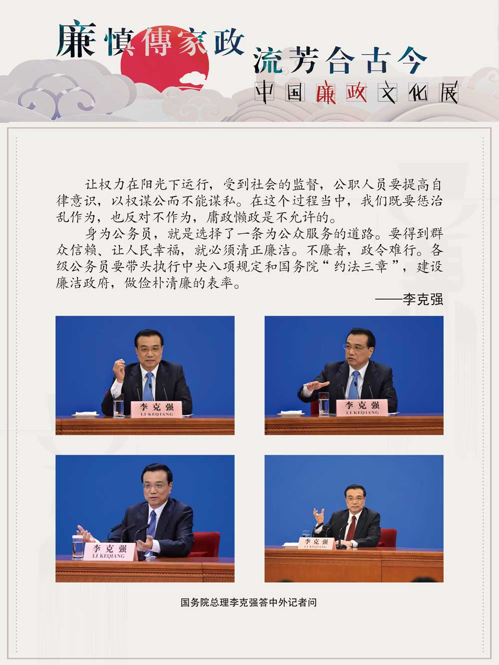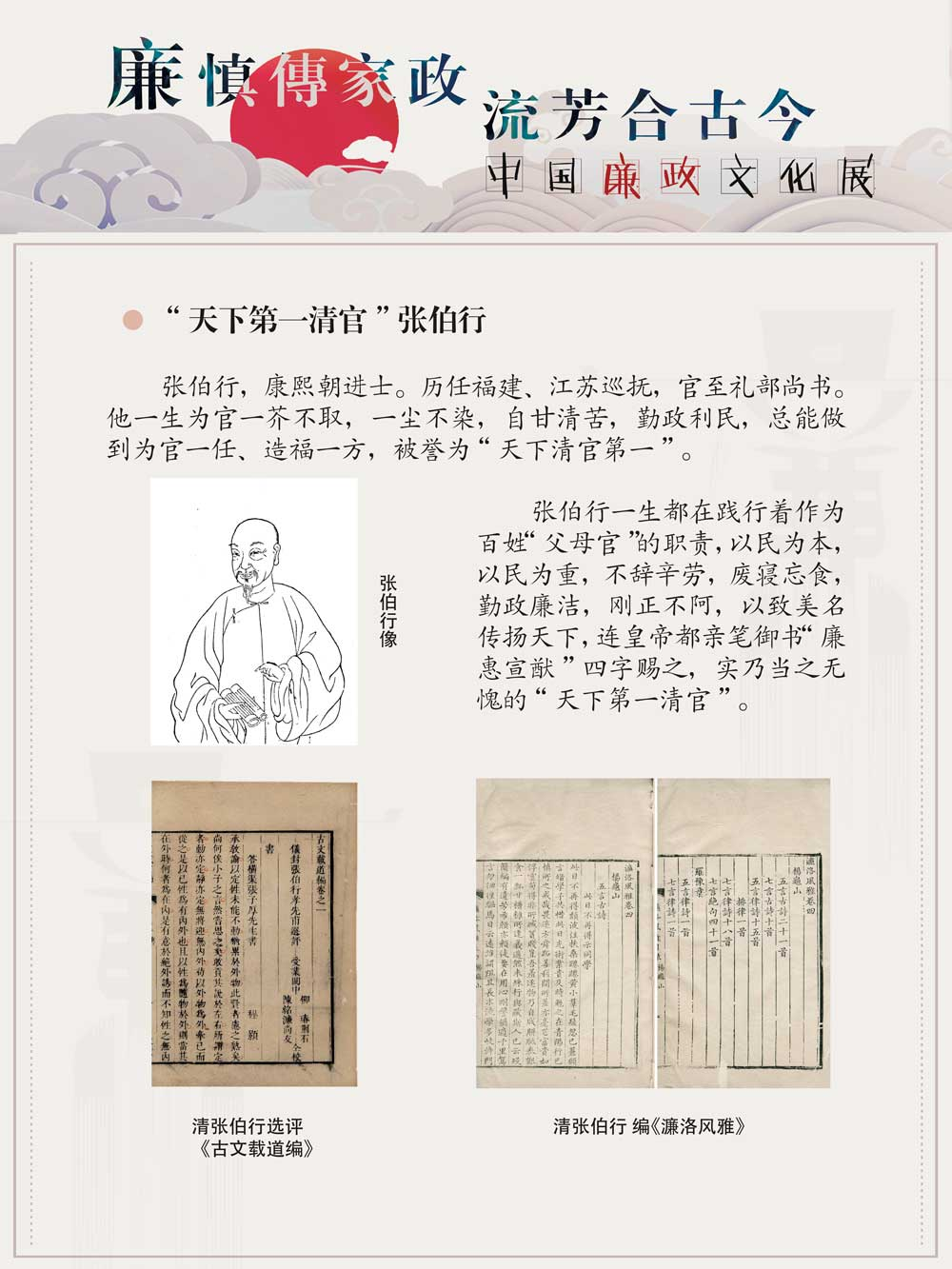 中国廉政文化源远流长。孔子有云:“其身正,不令而行;其身不正,虽令不从。”被清朝康熙帝誉为“天下第一清官”张伯行也曾说过:“一丝一粒,我之名节;一厘一毫,民之脂膏。宽一分,民受赐不止一分;取一文,我为人不值一文。”