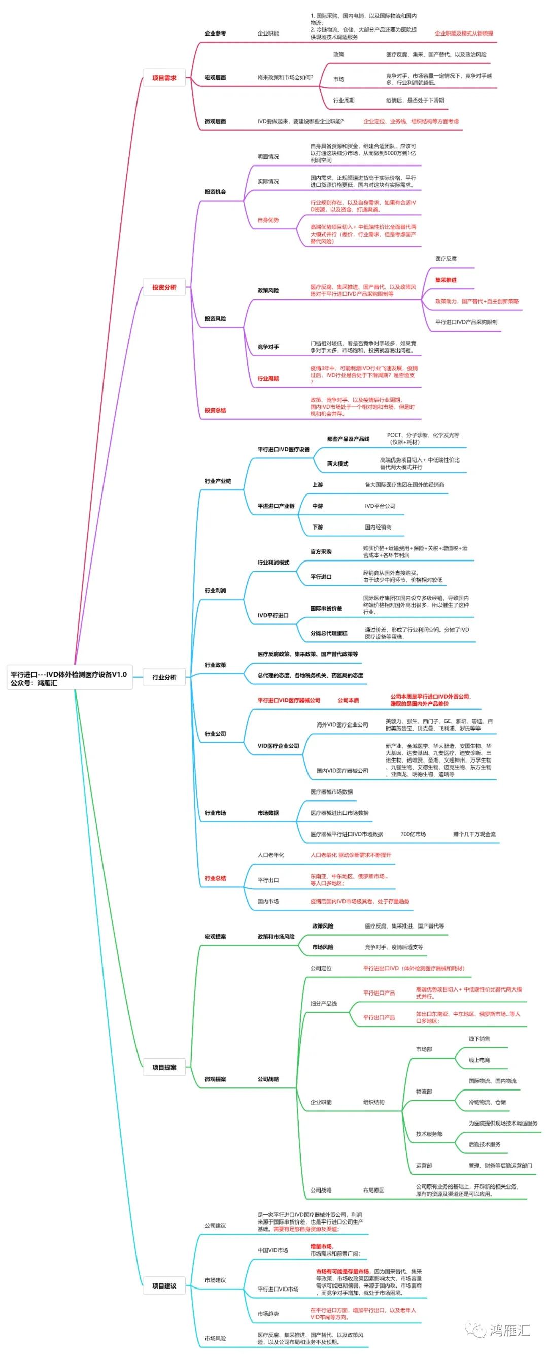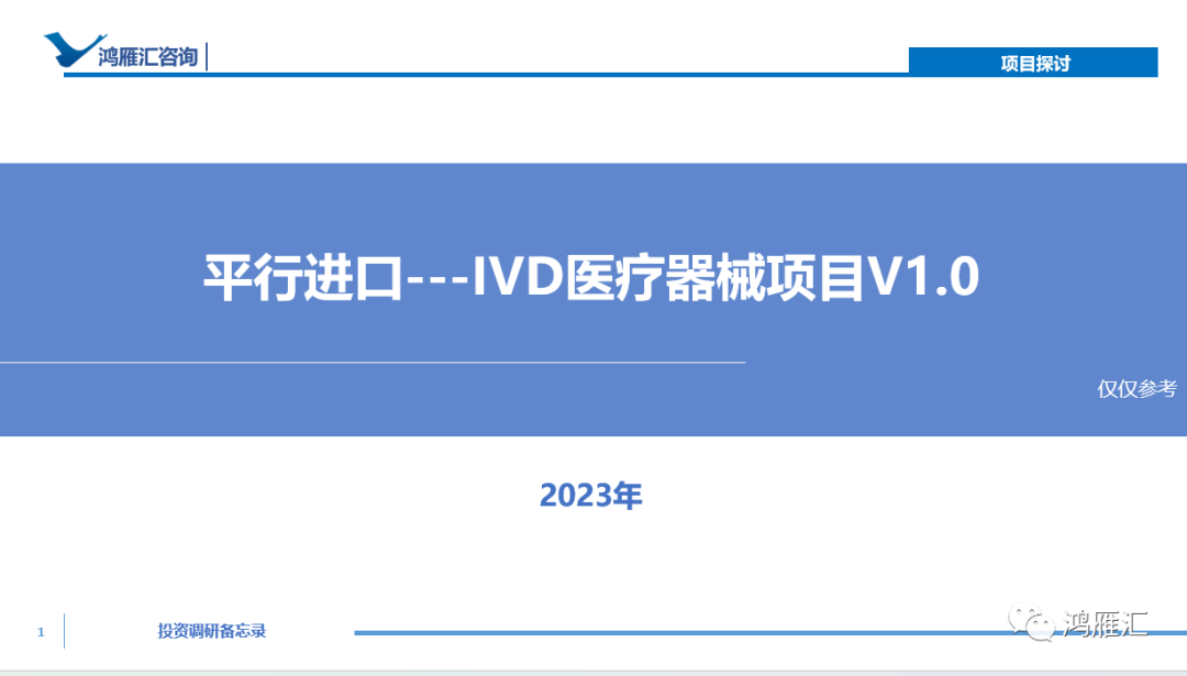 项目简介:2023年9月,我们参与某平行进口可研项目,其客户要求:3年前,想进入平行进口中的IVD赛道,结果错失良机,3年后,想介入和组建团队,做到5000万到1亿,是否有机会?是否时机已经过去?就宏观方面而已,将来政策和市场如何,平行进口IVD要做起来,要建设那些企业职能?我们有幸参与项目可研,并且提供相应的建议。对应我们提供投资逻辑思维图、投资可研方案、以及投资测算模拟推理等。
