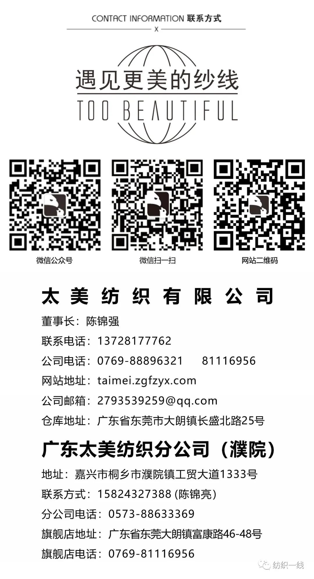 广东太美纺织品公司具有研发、生产、营销、服务一体化商业集团.目前色纺纱是一款能实现白胚、染色所不能达到的朦胧立体效果和质感,能在同一根纱线上进行多色彩展示。采用“先染色、后纺纱”的新工艺,相比传统工艺节水50%以上,可以最大程度地控制成衣色差,并且层次感更强。使用过程中几乎是0污染。受到毛织客户广泛认可。更符合低碳环保要求.满足国内外大小型企业的需求订购,保持良好关系的强大供应链资源。
