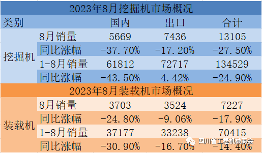 据中国工程机械工业协会对挖掘机主要制造企业统计,2023年8月挖掘机在国内销量5669台,相比下降37.7%;出口销量7436台,相比下降17.2%。