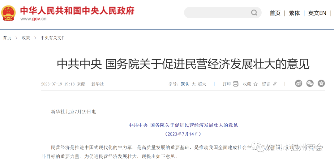 2023年7月19日中共中央、国务院发布《关于促进民营经济发展壮大的意见》。文件提出,民营经济是推动中国式现代化的生力军,是高质量发展的重要基础,是推动我国全面建成社会主义现代化强国、实现第二个百年奋斗目标的重要力量。在优化民营经济发展环境,依法保护民营企业产权和企业家权益,全面构建亲清政商关系,平等使用生产要素、公平参与市场竞争、同等受到法律保护等方面提出31条具体措施。