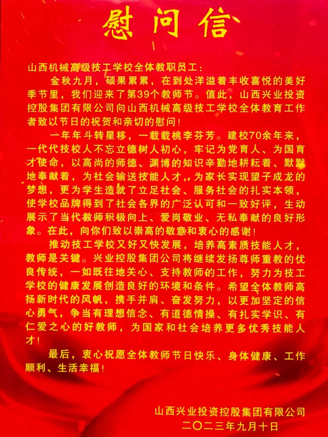春华秋实,桃李沁香。在第39个教师节来临之际,9月8日上午,山西兴业投资控股集团有限公司党委书记任志平、工会主席张娟一行赴山西机械高级技工学校开展教师节慰问活动,向全校广大教师和教育工作者致以节日的问候和美好的祝福。校长周晓飞、党总支书记王常海、副校长毋晓刚全程陪同。