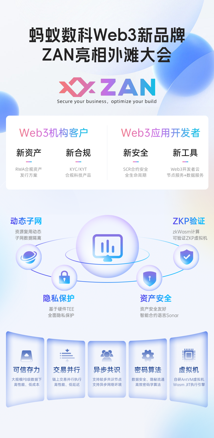 据介绍,面向企业机构客户,ZAN提供RealWorldAsset(RWA)合规资产发行解决方案,以及包括EKYC/KYT/AML在内的安全合规科技产品。面向Web3开发者群体,ZAN提供低成本、高性能、高可靠的云服务解决方案,覆盖智能合约开发、审计和部署监控的全生命周期,以及链上节点服务RPC、AA加速和数据智能等服务。此次品牌发布会中也公布了ZAN的首批合作伙伴,包括Morpheus Labs、HashKeyGroup及EverestVenturesGroup等。值得注意的是,HashKeyGroup集团旗下加密货币交易所「HashKey Exchange」于今年8月获得了香港首张加密货币零售交易牌照,此外在新加坡、日本等地也搭建了合规交易平台。HashKeyGroup Singapore CEO邓超表示:“整个行业从原来只关注技术,到现在开始关注应用和资产,底层的基础设施是非常重要的,我觉得ZAN在合适的时间点,给整个行业的大规模产业化应用,提供了一个非常必要的底层技术平台和解决方案。”另一合作方EverestVenturesGroup是助力Web3规模化合作主流应用的开发公司。EverestVenturesGroup CEO举例道,他们在今年上线了一款链游,随着大量用户的涌入,接口的稳定性受到了挑战,导致了延迟的出现。“我们团队已经有5年经验,有200多号工程师的一个开发团队都收到了极大的挑战。对主流的开发者来说,他们是不熟悉区块链的整体的服务,要从头去学习整体的底层的共识机制,如何去布节点,就好比像是互联网的早期,科技公司不只要会写代码,还要会要拉网线等等,学习的挑战是非常大的。所以我觉得接下来,在行业的持续的规模化的过程当中,是很需要像ZAN这样的长期平台,让开发者的工作变得更简单,最后开发者可能利用这样的科技做出一些意想不到的应用。”MorpheusLabs相关负责人则表示:“Zan的智能合约审核团队的深度专业知识,以及在智能合约场景应用、安全评估和漏洞检测方面的经验加强了我们产品的技术可靠性。”在开源内容方面,目前蚂蚁数科通过AntChain TrustBase,已经开源了跨链技术、全同态加密、合规AI等前沿技术,未来,AntChain TrustBase将按照基础硬件、密码、协议和工具四个技术层次并行推进开源计划,2023年完成基于全同态的密态计算技术栈、跨链核心服务、智能合约安全审计形式化工具等组件的开源。2024年进一步完成更多算法协议以及工具的开源。免责声明:本文为网络公开资料,内容仅供参考交流,不构成任何投资建议。任何读者若据此进行投资决策,风险自担。