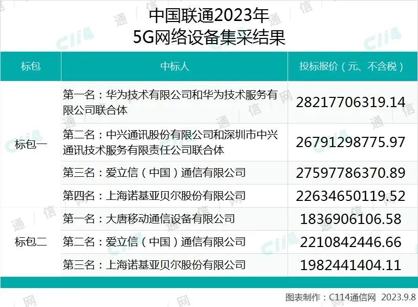 从中标情况看,两个标包,合计中标金额约300亿元,其中华为投标报价最高。此次中国联通未公示具体中标份额,但66万站的标包一由华为、中兴、爱立信和上海诺基亚贝尔4家瓜分,其中华为第一名;中兴第二名。