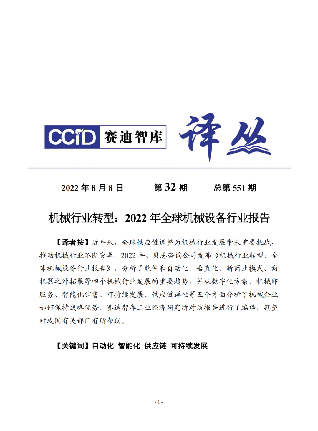 关注我们,后台回复“202309083”就可以获取《赛迪智库:机械行业转型:2022年全球机械设备行业报告》(完整版) 的全文下载链接。