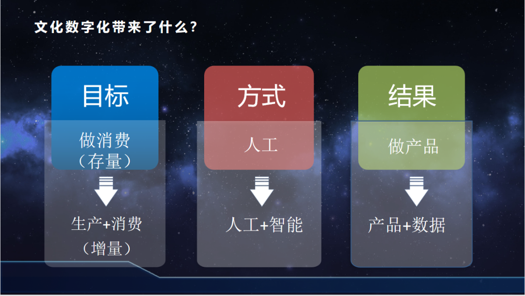 通过回顾政策,高凯指出,文化数字化是以“生产+消费”的增量为目标,以“人工+智能”的方式生成“产品+数据”。未来,文化产业构建将以数据为核心,促进文化数据资源融通融合。