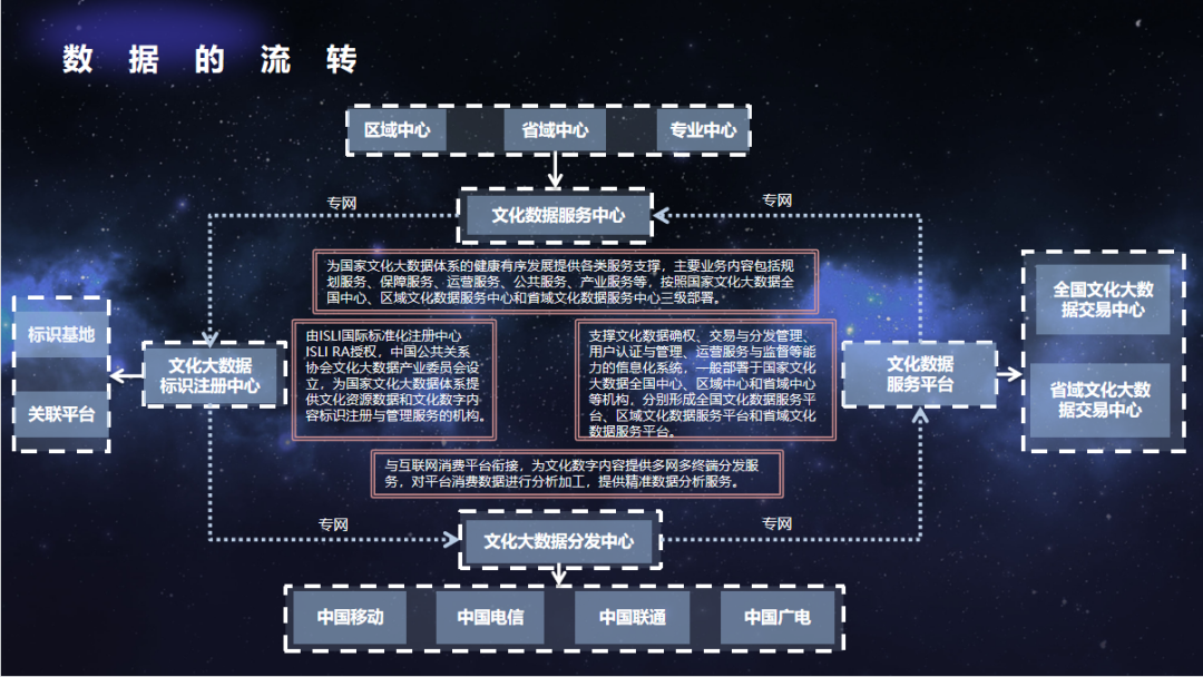 高凯解释数据的流转是基于专网在文化数据服务中心、文化大数据标识注册中心、文化大数据分发中心、文化数据服务平台四个中心平台进行流转。