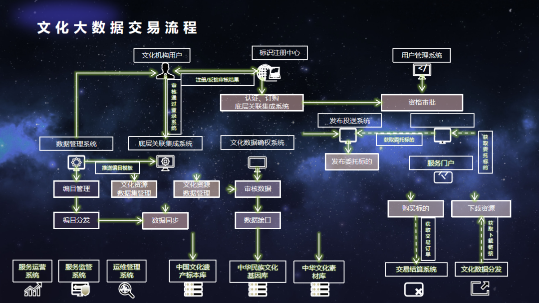 在文化大数据交易流程上,高凯以上图为例介绍了基于数据管理系统、底层关联集成系统、文化数据确权系统和发布投送系统为中心的交易模式。