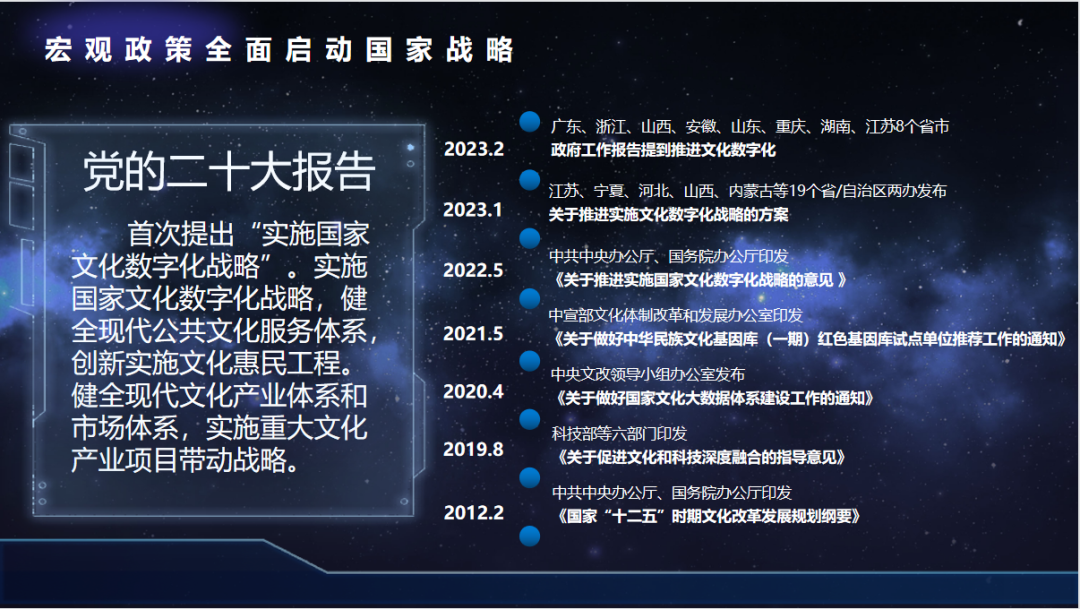 从2012年2月中共中央办公厅、国务院办公厅印发《国家“十二五”时期文化改革发展规划纲要》,到2022年5月中共中央办公厅、国务院办公厅印发《关于推进实施国家文化数字化战略的意见》,直到2023年2月广东、浙江、山西、安徽、山东、重庆、湖南、江苏8个省市政府工作报告中明确提到推进文化数字化。一系列政策出台表明国家文化数字化战略已在宏观层面全面启动。