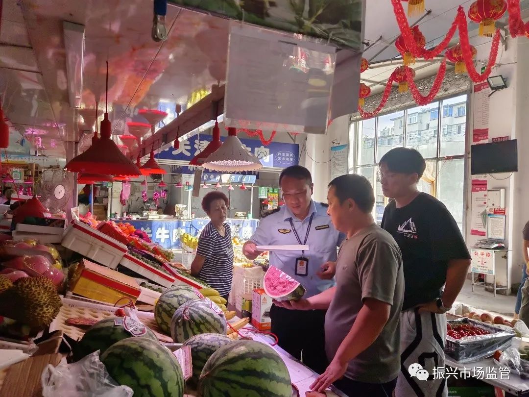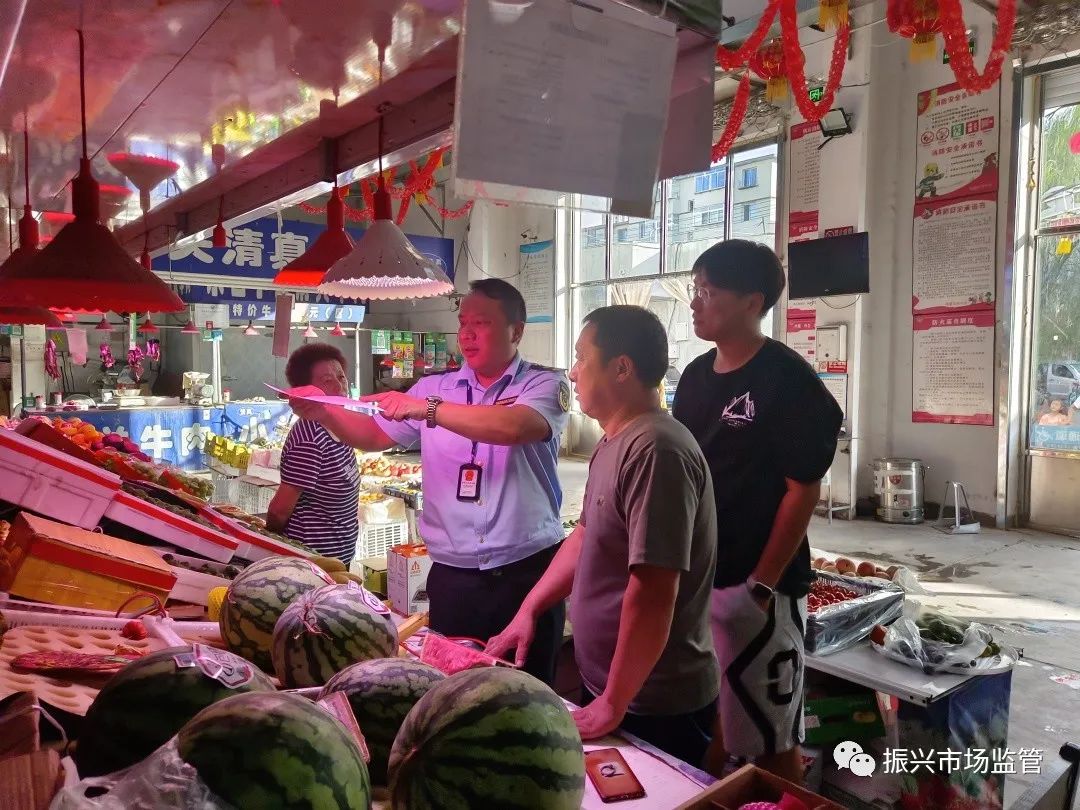8月31日,振兴区市场监督管理局食品监督管理科对伟豪农贸市场开展相关检查和指导,向经营者宣传普及《食用农产品市场销售质量安全监督管理办法》关于经营者不得使用“生鲜灯”误导消费者等规定。