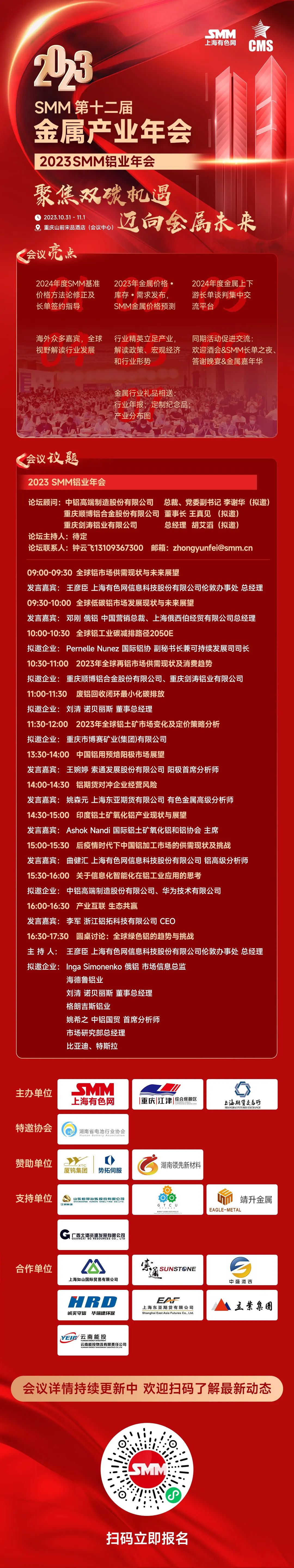 2023 SMM金属产业年会,将于10月31日-11月1日,在重庆召开,会议聚焦金属价格行情、市场趋势、贸易形势、行业政策和低碳技术等热点话题,邀请到行业专家、学者、企业大咖、宏观经济学家和资深分析员等专家做主题演讲。除会议论坛外,还特设企业供需洽谈、长单之夜、 金属嘉年华等环节。欢迎大家报名参与2023金属产业年会