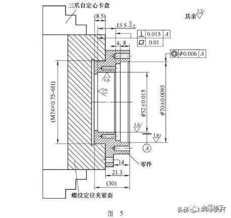 2、加工时,由三爪自定心卡盘径向夹紧改为图5所示的螺纹拉紧。