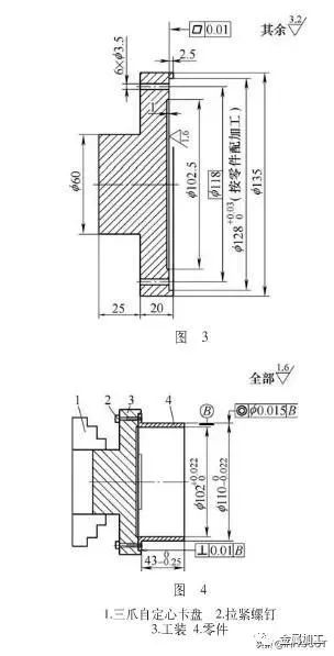 2、按照图3制作专用工装,加工时按照图4采取轴向夹紧方式,一次装夹完成精加工。